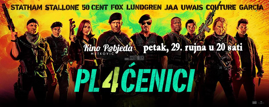U Kinu 'Pobjeda' Metković u petak, 29. rujna s početkom u 20 sati na rasporedu je akcijski triler 'Plaćenici 4'. Plaćenici se vraćaju na velika platna u svom četvrtom izdanju i ponovo predstavljaju najveća imena glumačke akcijske scene. Jason Statham, Andy Garcia, Sylvester Stallone i Dolph Lundgren donose vam novu dozu